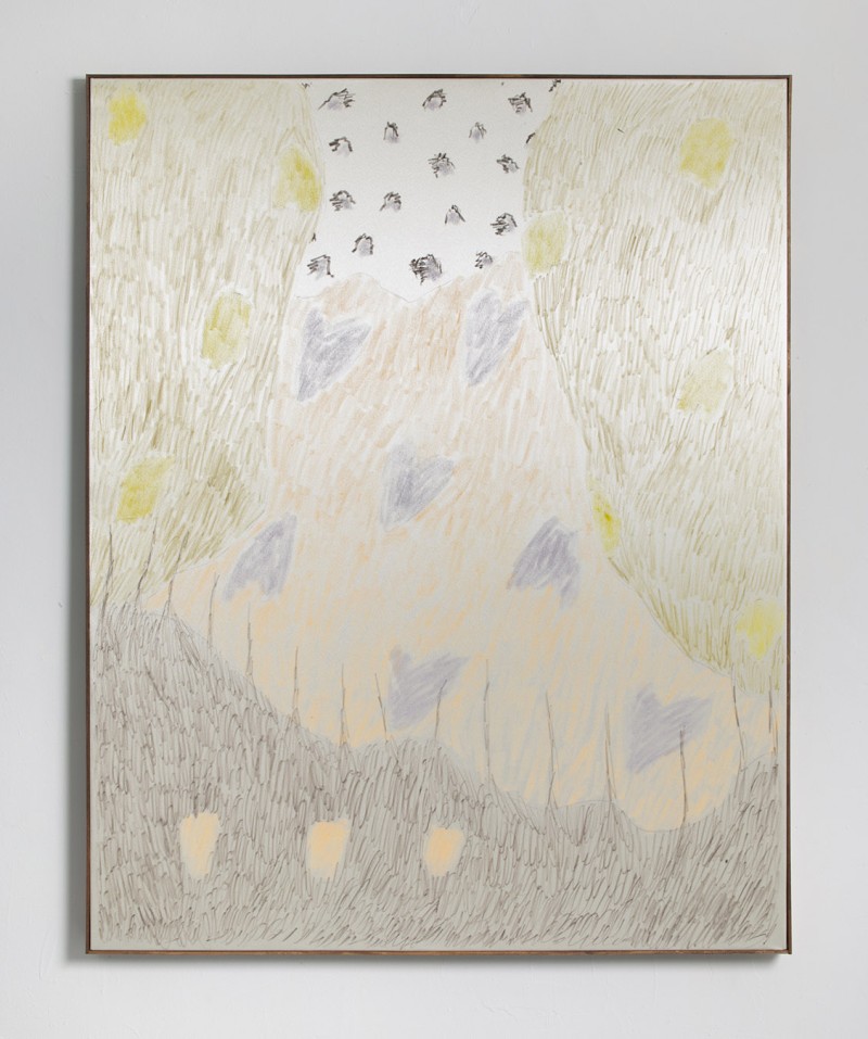 Entering the exhibition titled “Widow’s Walk”, the viewer must visit a darkened interior space within the gallery. Heavily referencing landscape painting (Bonnard, or the Group of Seven), works are painted on satin and rendered with soft pastel and oil. The matte forms and gestures made with pigment shroud the sparkling ground creating a near-illusion of natural light and space, remaining abstracted and blurred so there can be no confirmations or assurances. Each work is emphasized by a single wall-mounted sconce, typical to lighting art works in museums and galleries. This clinical yet societally elevated spot light attaches itself to the importance we assign to certain memories and places. The Widow’s Walk is a protected place, a place of avoidance of the real, a place for preservation of hope.