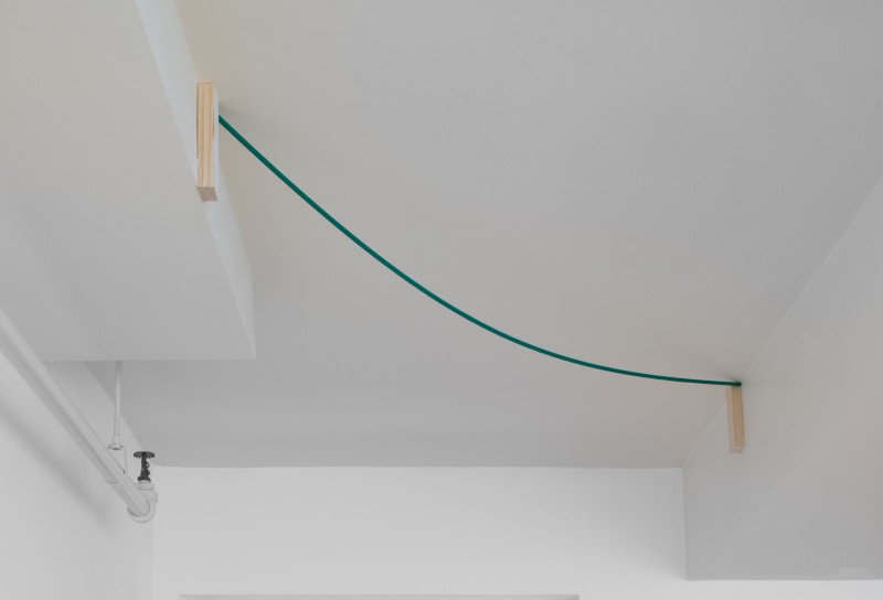 Between the Window and the Pipe is the third in a series of site-specific sculptures. A 20-foot steel rod is wedged between the walls of the 9 x 13 x 8 foot room. A second rod, cropped to 52–3/8 inches, hovers above and between two dropped ceilings. The painted gestures frame what exists, transform how one moves through the space, and read as pictorial drawings in space. The painted line registers the height of the windowsill, notated by a plywood sculpture cantilevered inside and outside of the window. Leading into the exhibition space is a painting made of silk mesh stretched onto rubber tubing connected with extracts of steel rod. The shape of this painting–like the steel’s curve–is a consequence of gravity and tension.