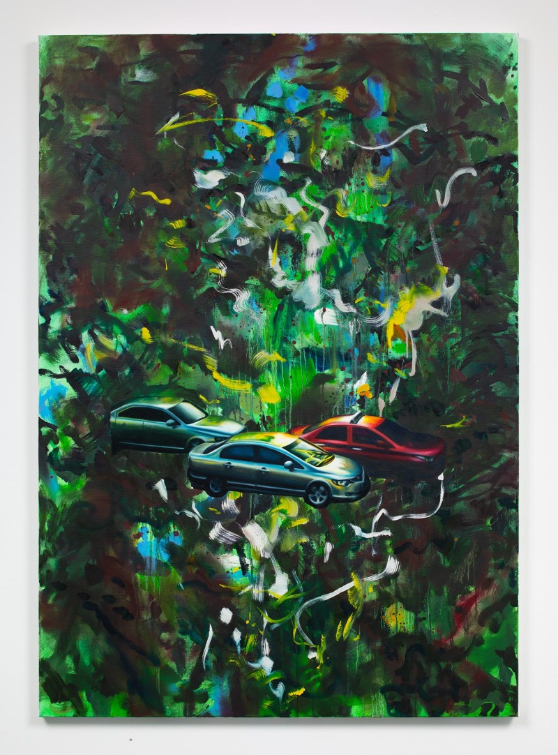 In “Mephistopheles”, a gigantic sphinx-like cat emerges from the photorealistic interior of a minivan, disrupting the triumphalism of the suburban America that looms in the background. “Birdbraidedbrain” depicts three slick cars suspended on a plane before a thick and foreboding background of textured brushwork. Here, it is the figurative car that appears to be out of place, lost in an unsettling forest of abstract strokes. The reoccurring wallpaper motifs of vines and tendrils in several other works - an allusion to the Art Noveau movement and its romanticized representations of nature - gesture to both the linearity of art history and the rigidity of domestic space.